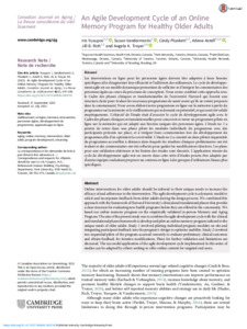 It is advisable to refer to the publisher's version if you intend to cite from this work. See Guidance on citing. To link to this item DOI: 10.1017/S0714980821000763 Abstract/SummaryOnline interventions for older adults should be tailored to their unique needs to increase the efficacy of and adherence to the intervention. The agile development cycle is a dynamic model to solicit and incorporate feedback from older adults during the design process. We combined this approach with the framework of Harvard University’s clinical and translational phases that provide a clear structure for evaluating new health programs before they are offered in the community. We based our online memory program on the empirically validated in-person Memory and Aging Program. The aim of the present study was to combine the agile development cycle with the clinical and translational phases framework to develop and pilot an online memory program tailored to the unique needs of older adults. Study 1 involved piloting individual program modules on site and integrating participant feedback into the program’s design to optimize usability. Study 2 involved two sequential pilots of the program accessed remotely to evaluate preliminary clinical outcomes and obtain feedback for iterative modifications. Plans for further validation and limitations are discussed. The successful application of the agile development cycle implemented in this series of studies can be adapted by others seeking to offer online content for targeted end users.