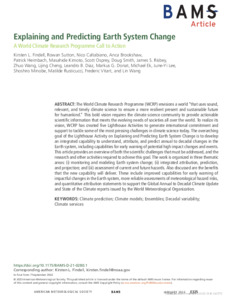 It is advisable to refer to the publisher's version if you intend to cite from this work. See Guidance on citing. To link to this item DOI: 10.1175/BAMS-D-21-0280.1 Abstract/SummaryThe World Climate Research Programme (WCRP) envisions a world “that uses sound, relevant, and timely climate science to ensure a more resilient present and sustainable future for humankind.” This bold vision requires the climate science community to provide actionable scientific information that meets the evolving needs of societies all over the world. To realize its vision, WCRP has created five Lighthouse Activities to generate international commitment and support to tackle some of the most pressing challenges in climate science today. The overarching goal of the Lighthouse Activity on Explaining and Predicting Earth System Change is to develop an integrated capability to understand, attribute, and predict annual to decadal changes in the Earth system, including capabilities for early warning of potential high impact changes and events. This article provides an overview of both the scientific challenges that must be addressed, and the research and other activities required to achieve this goal. The work is organized in three thematic areas: (i) monitoring and modeling Earth system change; (ii) integrated attribution, prediction and projection; and (iii) assessment of current and future hazards. Also discussed are the benefits that the new capability will deliver. These include improved capabilities for early warning of impactful changes in the Earth system, more reliable assessments of meteorological hazard risks, and quantitative attribution statements to support the Global Annual to Decadal Climate Update and State of the Climate reports issued by the World Meteorological Organization.