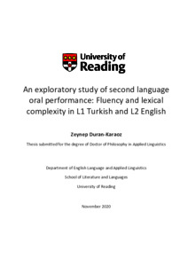 An exploratory study of second language oral performance: fluency and lexical complexity in L1 Turkish and L2 EnglishDuran Karaoz, Z. (2020) An exploratory study of second language oral performance: fluency and lexical complexity in L1 Turkish and L2 English. PhD thesis, University of Reading