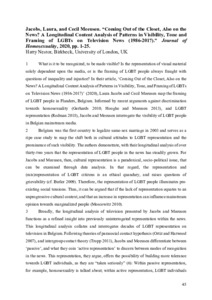 It is advisable to refer to the publisher's version if you intend to cite from this work. See Guidance on citing. To link to this item DOI: 10.18716/ojs/gefo/2020.2541 Abstract/SummaryWhat is it to be recognized, to be made visible? Is the representation of visual material solely dependent upon the media, or is the framing of LGBT people always fraught with questions of inequality and injustice? In their article, ‘Coming Out of the Closet, Also on the News? A Longitudinal Content Analysis of Patterns in Visibility, Tone, and Framing of LGBTs on Television News (1986 -2017)’ (2020), Laura Jacobs and Cecil Meeusen map the framing of LGBT people in Flanders, Belgium. Informed by recent arguments against discrimination towards homosexuality (Gerhards 2010; Hooghe and Meeusen 2013), and LGBT representation (Redman 2018), Jacobs and Meeusen interrogate the visibility of LGBT people in Belgian mainstream media.