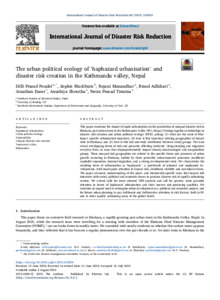 It is advisable to refer to the publisher's version if you intend to cite from this work. See Guidance on citing. To link to this item DOI: 10.1016/j.ijdrr.2023.103924 Abstract/SummaryThis paper examines the impact of rapid urbanisation on the production of unequal disaster risk in Khokana, peri-urban town in the Kathmandu Valley, Nepal. It brings together scholarships in disaster risk creation and urban political ecology, asking: (1) what are the roots of Khokana’s specific urbanisation trajectory; (2) how is this trajectory altering geographies of hazard risks in Khokana; and (3) how is this risk unevenly distributed between social groups. The data reveal overlapping forms of risk and precarity affecting residents’ (long-standing and migrants) everyday lives, in ways that disproportionately impact already-disadvantaged and marginalised groups. These unequal risk geographies are related to the specific forms and processes of urban growth occurring in Khokana, fuelled by three powerful, interconnected pressures: neoliberal capitalist expansion, internal migration, and a strong developmental state. We characterise the resulting form of urbanisation as ‘haphazard’: a patchwork of planned and unplanned developments, with inadequate attention to hazard risk, livelihood stability and essential services. The paper advances understanding of the place- and historically-specific ways that hazard risk intersects with social, political and economic forces to produce disaster risk in rapidly-urbanising centres. We extend calls for more situated UPE analysis and call for greater, more granular attention to forms of haphazard urbanisation and their uneven risk-producing qualities. We conclude an urgent need to reimagine urban development as a political and economic project, and for future urban planning to pay deliberate and deliberative attention to risk factors, both in KV and in other rapidly urbanising areas of the global South.