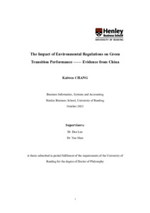 The impact of environmental regulations on green transition performance —— evidence from ChinaChang, K. (2023) The impact of environmental regulations on green transition performance —— evidence from China. PhD thesis, University of Reading