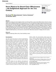 It is advisable to refer to the publisher's version if you intend to cite from this work. See Guidance on citing. To link to this item DOI: 10.1177/10564926231224213 Abstract/SummaryDespite an increasing remit and recognition of the role of the board Chair, resources that effective Chairs of the 21st century deploy remain inadequately explored in the existing literature. This article addresses this gap through the innovative use of 57 face-to-face, elite interviews with board members and provides new insights into the best practices of Chairs of the largest listed companies in the United Kingdom. The findings of the study indicate that effective leadership of boards requires an enlightened approach, with seven Mantras of effective board leading being commonly employed. These Mantras are—support for the CEO, lead with values, exercise influence (not power), compose diverse boards, communicate inclusively, resolve conflicts intuitively and reflect and course correct. The article makes a three-fold contribution: to resource-based theory and enlightened leadership theory, to the literature on board Chair effectiveness and praxis of leading in the 21st century.