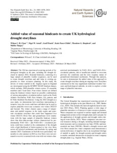 It is advisable to refer to the publisher's version if you intend to cite from this work. See Guidance on citing. To link to this item DOI: 10.5194/nhess-24-1065-2024 Abstract/SummaryThe UK has experienced recurring periods of hydrological droughts in the past, including the drought declared in summer 2022. Seasonal hindcasts, consisting of a large sample of plausible weather sequences, can be used to create drought storylines and add value to existing approaches to water resources planning. In this study, the drivers of winter rainfall in the Anglian region in England are investigated using the ECMWF SEAS5 hindcast dataset, which includes 2850 plausible winters across 25 ensemble members and 3 lead times. Four winter clusters are defined using the hindcast winters based on possible combinations of various atmospheric circulation indices (such as North Atlantic Oscillation (NAO), East Atlantic (EA) pattern and the El-Niño Southern Oscillation). Using the 2022 drought as a case study, we demonstrate how storylines representing alternative ways the event could have unfolded can be used, to explore plausible worst cases over winter 2022/23 and beyond. The winter clusters span a range of temperature and rainfall response in the study region and represent circulation storylines that could have happened over winter 2022/23. River flow and groundwater level simulations with the large sample of plausible hindcast winters show that drier than average winters characterised by predominantly NAO-/EA- and NAO+/EA- circulation patterns could have resulted in the continuation of the drought with a high likelihood of below normal to low river flows across all selected catchments and boreholes by spring and summer 2023. Catchments in Norfolk were particularly vulnerable to a dry summer in 2023 as river flows were not estimated to recover to normal levels even with wet winters characterised predominantly by NAO-/EA+ and NAO+/EA+ circulation patterns, due to insufficient rainfall to overcome previous dry conditions and the slow response nature of groundwater-dominated catchments. Through this analysis, we aim to demonstrate the added value of this approach to create drought storylines during an ongoing event. Storylines constructed in this way supplement traditional weather forecasts and hydrological outlooks to explore a wider range of plausible outcomes.