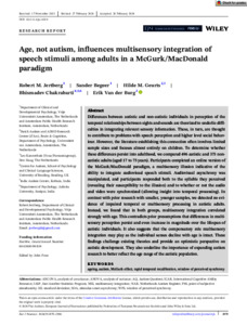 It is advisable to refer to the publisher's version if you intend to cite from this work. See Guidance on citing. To link to this item DOI: 10.1111/ejn.16319 Abstract/SummaryDifferences between autistic and non-autistic individuals in perception of the temporal relationships between sights and sounds are theorized to underlie difficulties in integrating relevant sensory information. These, in turn, are thought to contribute to problems with speech perception and higher level social behaviour. However, the literature establishing this connection often involves limited sample sizes and focuses almost entirely on children. To determine whether these differences persist into adulthood, we compared 496 autistic and 373 non-autistic adults (aged 17 to 75 years). Participants completed an online version of the McGurk/MacDonald paradigm, a multisensory illusion indicative of the ability to integrate audiovisual speech stimuli. Audiovisual asynchrony was manipulated, and participants responded both to the syllable they perceived (revealing their susceptibility to the illusion) and to whether or not the audio and video were synchronized (allowing insight into temporal processing). In contrast with prior research with smaller, younger samples, we detected no evidence of impaired temporal or multisensory processing in autistic adults. Instead, we found that in both groups, multisensory integration correlated strongly with age. This contradicts prior presumptions that differences in multisensory perception persist and even increase in magnitude over the lifespan of autistic individuals. It also suggests that the compensatory role multisensory integration may play as the individual senses decline with age is intact. These findings challenge existing theories and provide an optimistic perspective on autistic development. They also underline the importance of expanding autism research to better reflect the age range of the autistic population. Download Statistics DownloadsDownloads per month over past year Deposit Details University Staff: Request a correction | Centaur Editors: Update this record |