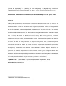 It is advisable to refer to the publisher's version if you intend to cite from this work. See Guidance on citing. To link to this item DOI: 10.1016/j.jbusres.2024.114672 Abstract/SummaryAlthough the governance of Decentralized Autonomous Organizations (DAOs) has attracted the interest of several academics, few studies have empirically examined how DAOs are governed. We use an exploratory, inductive approach to comprehensively examine how DAOs are currently governed and the ramifications of this. We conducted in-depth interviews with 20 DAO members from a variety of sectors to identify how they arrange their voting processes, distribute collaborative decision-making, and maintain their tokens. Three themes emerge from the thematic analysis of the data: (1) voting structure, (2) proposal management, and (3) token management. Participants describe the notion of DAOs as closely aligned with stewardship philosophy, encompassing collaborative and altruistic activity toward a common purpose. However, the operations and methods implemented are more oriented toward agency viewpoints due to their reliance on incentive-based processing and are based on a lack of trust among DAO stakeholders. This study provides empirical insights into DAO governance mechanisms.