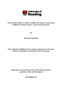 Understanding resilience to climate variability and change in common bean smallholder farming in Malawi: a gender-based perspectiveDambuleni, K. R. (2022) Understanding resilience to climate variability and change in common bean smallholder farming in Malawi: a gender-based perspective. PhD thesis, University of Reading