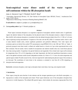 It is advisable to refer to the publisher's version if you intend to cite from this work. See Guidance on citing. To link to this item DOI: 10.1016/j.jqsrt.2024.109198 Abstract/SummaryWater vapour continuum absorption is an important component of atmospheric radiative transfer codes. It significantly impacts the radiative balance of the atmosphere, but the physical nature of this absorption remains a subject of discussion. Here the H2O self-continuum absorption is considered within the infrared absorption bands (from 50 to 11 200 cm-1) of water vapour exploiting existing measurements. Comparison of this data with the MT_CKD-3.5 continuum model, which is used in many radiative transfer codes, reveals significant quantitative and qualitative differences. New water vapour self-continuum spectra are derived from earlier FTS measurements using HITRAN-2016 in the 5300 and 7200 cm-1 bands. A previously proposed water dimer model is refined and unified based on a broad set of up-to-date experimental data on the H2O continuum. The new model, which is suitable for incorporation into radiative transfer codes, has a much firmer physical basis than existing models. It reproduces the spectral behaviour and magnitude of the in-band water vapour self-continuum for temperatures from 279 to 431 K depending on the band. Importantly, the fitted total equilibrium dimerization constant used in the updated continuum model exceeds independent estimates by a factor of 1.5–3 across the entire temperature and spectral regions studied. Possible causes for this, which are important for understanding the physical origin of the continuum, are discussed. The contribution of water dimer to the continuum is estimated to vary from 40 to 90% depending on absorption band and temperature.
