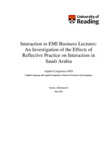 Interaction in EMI business lectures: an investigation of the effects of reflective practice on interaction in Saudi ArabiaAlmuuawi, A. (2022) Interaction in EMI business lectures: an investigation of the effects of reflective practice on interaction in Saudi Arabia. PhD thesis, University of Reading
