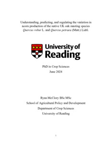 Understanding, predicting, and regulating the variation in acorn production of the native UK oak masting species Quercus robur L. and Quercus petraea (Matt.) Liebl.McClory, R. (2024) Understanding, predicting, and regulating the variation in acorn production of the native UK oak masting species Quercus robur L. and Quercus petraea (Matt.) Liebl. PhD thesis, University of Reading