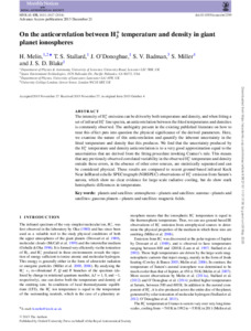 It is advisable to refer to the publisher's version if you intend to cite from this work. See Guidance on citing. To link to this item DOI: 10.1093/mnras/stt2299 Abstract/SummaryThe intensity of H3+ emission can be driven by both temperature and density, and when fitting a set of infrared H3+ line spectra, an anticorrelation between the fitted temperatures and densities is commonly observed. The ambiguity present in the existing published literature on how to treat this effect puts into question the physical significance of the derived parameters. Here, we examine the nature of this anticorrelation and quantify the inherent uncertainty in the fitted temperature and density that this produces. We find that the uncertainty produced by the H3+ temperature and density anticorrelation is to a very good approximation equal to the uncertainties that are derived from the fitting procedure invoking Cramer’s rule. This means that any previously observed correlated variability in the observed H3+ temperature and density outside these errors, in the absence of other error sources, are statistically separated and can be considered physical. These results are compared to recent ground-based infrared Keck Near InfRared echelle SPECtrograph (NIRSPEC) observations of H3+ emission from Saturn’s aurora, which show no clear evidence for large-scale radiative cooling, but do show stark hemispheric differences in temperature.