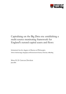 Capitalising on the Big Data era: establishing a multi-source monitoring framework for England's natural capital assets and flowsCrowson Davidson, M. R.D. (2024) Capitalising on the Big Data era: establishing a multi-source monitoring framework for England's natural capital assets and flows. PhD thesis, University of Reading