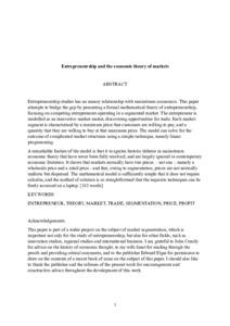 It is advisable to refer to the publisher's version if you intend to cite from this work. See Guidance on citing. To link to this item DOI: 10.1561/0300000134 Abstract/SummaryEntrepreneurship studies has an uneasy relationship with mainstream economics. This paper attempts to bridge the gap by presenting a formal mathematical theory of entrepreneurship, focusing in competing entrepreneurs operating in a segmented market. The entrepreneur is modelled as an innovative market-maker, discovering opportunities for trade, Each market segment is characterised by a maximum price that customers are willing to pay, and a quantity that they are willing to buy at that maximum price. The model can solve for the outcome of complicated market structures using a simple technique, namely linear programming. A remarkable feature of the model is that it re-ignites historic debates in mainstream economic theory that have never been fully resolved, and are largely ignored in contemporary economic literature. It shows that markets normally have two prices-not one– namely a wholesale price and a retail price-and that, owing to segmentation, prices are not normally uniform but dispersed. The mathematical model is sufficiently simple that it does not require calculus, and the method of solution is so straightforward that the requisite techniques can be freely accessed on a laptop.