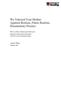 This thesis and its associated practice-as-research film, We Tattooed Your Mother, explore filmic realism and documentary objectivity through Karen Barad’s agential realism (1996; 2007). The practice-based research makes methodological use of editing, sound and visual effects to complicate the apparently teleological relationship between myself, my Brazilian, Catholic mother Regina, her mother Edith, and her Polish, Jewish grandmother Helena/Hencza. I term this methodology devised through rigorous experimentation diffractive, after Barad’s adaptation (2007; 2014) of Donna Haraway’s term (1997; 2004). The written and filmic components of this research thus generate a theory-practice-theory feedback loop through an essayistic first-person documentary of my transnational matrilineal genealogy, resulting in a filmic materialisation of my mother’s and my own entangled embodied reality. We Tattooed Your Mother investigates our entwined intergenerational identities, including questions of gender, sexuality, nationality, ethnicity, class and religion within the context of a relatively commonplace scenario of Eastern European Jews immigrating to early 20th Century Brazil. The film is a story about intergenerational hauntings, the powerful currents of geopolitics and migration, and the complexities, limits and possibilities of an auto/biographical film produced over more than a decade. Barad’s account enfolds theoretical quantum physics with feminist and queer theory to challenge the representational metaphysics that also permeates documentary theory. Drawing from Barad’s materialist update (2007) of Judith Butler’s performativity (1999; 2011), I propose that the filmmaking apparatus is performative. I argue that agential realism generates a framework for documentary objectivity without a representational foundation that intrinsically separates human practices from nature. Engaging filmic realism through agential realism, I illustrate how Barad’s work suggests a different understanding of how film meaningfully enacts the world on screen. I conclude that, at their best, documentary films inspire a rethinking of reality by displacing boundaries that might otherwise be taken for granted, with material and ethical consequences.