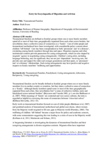 Transnational families are defined as familial groups where one or more family members spend all or most of their time geographically separated from each other across borders, but nevertheless share a collective sense of connection as a ‘family’. Care of older people and transnational motherhood have been investigated, with considerable policy concern about children ‘left behind’. Care has been conceptualised as both ‘proximate’ and ‘at a distance’, circulating among family members through time and space. Migration regimes and other institutional contexts provide parameters for caring arrangements, which are also shaped by migrants’ agency in negotiating caring arrangements. Children’s caring roles, including language brokering, may be significant; they are not just ‘dependents’ receiving care, but provide care and support for older and younger generations and their peers, in ‘proximate’ and ‘at a distance’ relationships. Such caring arrangements may have positive and negative impacts on family members’ wellbeing and opportunities.