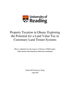 King, G. D. (2025) Property taxation in Ghana: exploring the potential for a land value tax in customary land tenure systems. PhD thesis, University of Reading. doi: 10.48683/1926.00121989