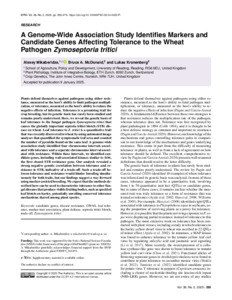 Mikaberidze, A., McDonald, B. A. and Kronenberg, L. (2025) A genome-wide association study identifies markers and candidate genes affecting tolerance to the wheat pathogen Zymoseptoria tritici. Molecular Plant-Microbe Interactions, 38 (2). pp. 265-274. ISSN 1943-7706 doi: 10.1094/mpmi-08-24-0085-fi