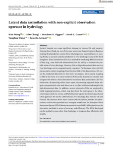 It is advisable to refer to the publisher's version if you intend to cite from this work. See Guidance on citing. To link to this item DOI: 10.1002/qj.5009 Abstract/SummaryNatural hazards can cause significant damage to human life and property. Among them, floods are one of the most severe and frequent natural disasters, making flood prediction crucial. River discharge is an essential factor in causing floods, so accurate and fast predicting river discharge is crucial for flood mitigation. Data assimilation (DA) as a method of combining different sources of data (e.g., state field and observations) has the ability to estimate the possible states of the river discharge. However, DA on high dimensional data such as river discharge can be computationally expensive. Furthermore, when the DA process lacks explicit mappings from the state field to the observations, DA cannot be effectively conducted. In this work, we design a latent neural mapping (LNM) in the form of a neural network (NN) as the observation operator and integrate this within a 3D-Variational DA framework. By operating within the latent space, the resulting approach helps mitigate computational costs and allow us to run DA within seconds despite the high dimensional data. In addition, several alternative NNs are employed to build mapping functions, which map data from the state space to the observation space (and vice versa), and benchmarked against the latent space based LNM approach. We test the LNM with real river discharge data from the UK and Ireland. The National River Flow Archive (NRFA) dataset provides the observations, and the data provided by a surrogate model from the European Flood Awareness System (EFAS) dataset served as the state field. LNM outperforms the alternative methods in terms of accuracy and efficiency. The developed LNM can be applied to areas other than hydrology to efficiently integrate data with models.