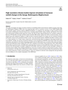 It is advisable to refer to the publisher's version if you intend to cite from this work. See Guidance on citing. To link to this item DOI: 10.1007/s00382-025-07716-6 Abstract/SummaryThis study investigates the impact of model resolution on simulating South Asian monsoon rainfall, focusing on the Ganges-Brahmaputra-Meghna (GBM) basin. By comparing high- and low-resolution versions of four CMIP6 HighResMIP model families against reference datasets (MSWEP and ERA5), we emphasize the advantages of high-resolution models in accurately simulating key monsoon characteristics, including annual rainfall, timing, intensity, and duration. Our results show that the high-resolution models align more closely with observed data, outperforming their low-resolution counterparts. Between 1979 and 2014, the high-resolution model ensemble (HR-models) captures key shifts in monsoon timing, such as delayed onset and withdrawal, leading to a slight increase in monsoon duration. In contrast, the low-resolution ensemble (LR-models) showed more pronounced delays in onset. The observational datasets, MSWEP and ERA5, indicate earlier (7±3 days) and later (3±1.2 days) onsets, respectively, with both showing delays in withdrawal, indicating extended monsoon duration. Notably, the increase in monsoon duration is more pronounced in MSWEP observations than in the model simulations, particularly for LR-models. Regarding rainfall trends, the HR-models more accurately reflect observed changes in both total rainfall and extreme rainfall from 1979-2014 compared to LR-models. Future projections (2015-2050) indicate further delays in monsoon onset, with HR-models projecting larger increases in total rainfall and extreme events (up to 4.5%/decade for the 95th percentile of rainfall) compared to LR-models, which show smaller increases and higher variability in total and extreme rainfall. These findings highlight the critical role of model resolution in improving the accuracy of monsoon simulations, with HR models offering more reliable simulations of historical monsoon behaviour and therefore likely more robust projections of future monsoon behavior. These are essential for informed water management and agricultural decision-making over the complex topography of the GBM basin.