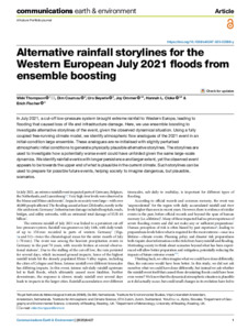 It is advisable to refer to the publisher's version if you intend to cite from this work. See Guidance on citing. To link to this item DOI: 10.1038/s43247-025-02386-y Abstract/SummaryIn July 2021 a cut-off low-pressure system brought extreme rainfall to Western Europe, leading to flooding that caused loss of life and infrastructure damage. Here, we use ensemble boosting to investigate alternative storylines of the event, given the observed dynamical situation. Using a fully-coupled free-running climate model we identify atmospheric flow analogues of the 2021 event in an initial-condition large ensemble. These analogues are re-initialized with slightly perturbed atmospheric initial conditions to generate physically plausible alternative storylines. These storylines are used to investigate how a potentially worse event could have unfolded given the same large-scale dynamics. We identify rainfall events with longer persistence and larger extent, yet the observed event appears to be towards the upper end of what is plausible in the current climate. Such storylines can be used to prepare for possible future events, helping society to imagine dangerous, but plausible, scenarios.