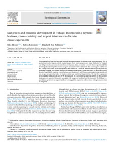 It is advisable to refer to the publisher's version if you intend to cite from this work. See Guidance on citing. To link to this item DOI: 10.1016/j.ecolecon.2025.108693 Abstract/SummaryGovernments have long faced potential trade-offs between economic development and protecting nature. This is particularly true for tropical and sub-tropical islands where most mangroves are found. Motivated by Trinidad and Tobago’s central government’s prior hotel development plans, we employ a discrete choice experiment (DCE) to investigate residents’ preferences for mangrove ecosystem services (ES) in the Bon Accord Lagoon and Buccoo Bay, Tobago. Preferences were investigated in the context of a trade-off between conserving mangroves and promoting economic development through a hypothetical hotel project in the study area. We use a Hierarchical Bayesian Logit Model, exploring two distinct payment horizons, 5 and 25-years, undertaken independently and also merged in models that allow for choice certainty and individual characteristics. We find that respondents have consistent willingness-to-pay (WTP) for mangrove ES and exhibit general insensitivity to the payment horizons due to perceived disbenefits associated with mangrove loss from hotel development. The DCE and ex-post (follow-up) interviews suggest that there is strong public support for policies aimed at long-term protection of mangroves.
