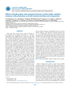 It is advisable to refer to the publisher's version if you intend to cite from this work. See Guidance on citing. To link to this item DOI: 10.3168/jds.2025-26577 Abstract/SummaryThere has been much recent research interest in the potential of macroalgae (seaweed) as a methane suppressing feed supplement for ruminants, but there are numerous potential seaweed species available that have varying compositions of potentially beneficial or deleterious consequence. Therefore the objective of the present study was to determine the effects of feeding 3 mixtures of 3 seaweeds at levels within EU regulatory limits for ration iodine concentration on methane production and milk yield and composition of dairy cows. Forty lactating (204 ± 5.6 DIM) Holstein cows were randomly assigned to one of 4 treatments (10 per treatment) in blocks based on DIM, parity, BW, and milk yield. Treatments were a control TMR and one of 3 seaweed mixtures replacing TMR grass silage: Ascophyllum nodosum, Fucus vesiculosus, and Asparagopsis taxiformis (AN, FV, and AT, respectively; 5:45:50 and 1.5 g/kg DM), AN and FV (AN:FV at 90:10 and 6.5 g/kg DM), or FV and AN (FV:AN at 90:10 and 17.5 g/kg DM). Cows were individually fed for ad libitum DMI in free-stall housing and treatments continued for 7 wk, with daily measurements of milk yield and DMI and weekly measurements of milk composition. Methane emission was estimated using 2 GreenFeed head chambers in wks 5 to 7 of treatment, milk mineral concentrations were measured in wks 1 to 6, and milk FA composition was measured in wk 6. Feeding the AN:FV and FV:AN mixtures had no effect on methane emission (g/d) or yield (g/kg DMI), whilst cows fed AT (0.075% of DM) in combination with AN and FV tended to have a lower methane emission (9 %) and methane yield (12 %) than cows fed the control diet and lower (20 %) methane intensity (g/kg ECM) than cows fed the AN:FV mixture. Cows fed all 3 seaweed mixtures had 1.7 to 2.2 fold higher milk iodine concentrations, which showed a wk by treatment interaction in that cows fed the AN:FV mixture had higher milk iodine concentrations in wks 3 and 5 of the study. Cows fed the AN:FV also had lower milk urea concentration, suggesting effects of AN and/or FV bioactive components on rumen protein degradation. Cows fed the AT:AN:FV mixture had lower concentrations of C18:3n6, and higher concentrations of C15:1 and C17:0, but there were no other effects of feeding seaweed on milk yield or composition. In conclusion, feeding a relatively small amount of AT (0.75 g/kg diet DM) with AN and FV reduced methane emission and yield by 9 and 12 %, respectively, and there was no effect of feeding mixtures of AN and FV without AT. Feeding a higher level of AN with FV (5.85 g/kg DM) reduced milk urea concentration, suggesting inhibitory effects of phytotannins or other bioactive components on protein degradation.