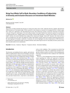 It is advisable to refer to the publisher's version if you intend to cite from this work. See Guidance on citing. To link to this item DOI: 10.1007/s10551-025-06055-0 Abstract/SummaryThis article critically examines the discourse of ‘bring your whole self to work’ within the diversity, equality, and inclusion (DEI) narratives of investment banks. While inclusion is often framed as essential for leveraging diversity, scholars argue that ‘whole self’ approaches risk individualising diversity and reinforcing systemic exclusions. Drawing on Foucault’s concepts of biopower, technologies of the self, and governance, this study explores how inclusion operates as a mechanism of organisational power, shaping subjectivities through corporate DEI statements. Using discourse analysis of investment banks’ websites, the article identifies three subjectivities constructed through ‘whole self’ discourse: the whole self as a driver of productivity, the whole self shaped by wellness and mindset, and the whole self oriented towards personal growth. By interrogating the boundary conditions of inclusion, the article highlights the ethical implications of DEI discourse, questioning how organisations define acceptable identities and reinforcing the need for structurally inclusive practices that move beyond surface-level commitments.