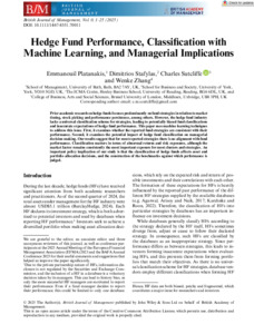 It is advisable to refer to the publisher's version if you intend to cite from this work. See Guidance on citing. To link to this item DOI: 10.1111/1467-8551.70011 Abstract/SummaryPrior academic research on hedge funds focuses predominately on fund strategies in relation to market timing, stock picking, and performance persistence, among others. However, the hedge fund industry lacks a universal classification scheme for strategies, leading to potentially biased fund classifications and inaccurate expectations of hedge fund performance. This paper uses machine learning techniques to address this issue. First, it examines whether the reported fund strategies are consistent with their performance. Second, it examines the potential impact of hedge fund classification on managerial decision making. Our results suggest that for most reported strategies there is no alignment with fund performance. Classification matters in terms of abnormal returns and risk exposures, although the market factor remains consistently the most important exposure for most clusters and strategies. An important policy implication of our study is that the classification of hedge funds affects asset and portfolio allocation decisions, and the construction of the benchmarks against which performance is judged.