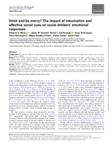 It is advisable to refer to the publisher's version if you intend to cite from this work. See Guidance on citing. To link to this item DOI: 10.1093/alcalc/agaf046 Abstract/SummaryBackground: While alcohol’s ability to impact affective states and lubricate social interactions is well documented, less research has considered this in crowd contexts. Method: Using a Social Emotion Paradigm, intoxicated (0.8g/kg) or sober (placebo) participants (N=47, 49% female, Mage=21.47) were presented with virtually modelled groups of characters displaying various affective states (happy, neutral, sad). Participants’ emotional responses to the stimuli were assessed via self-report (Study 1) and, one week later, objective measures of facial muscle movement (facial electromyography; Study 2). Results: Study 1.Self-reported emotions largely mirrored the emotive displays, pointing to emotional contagion. No significant effect of intoxication was apparent. Study 2. Compared to those in the sober conditions, significantly more smiling occurred among intoxicated participants when viewing sad crowds. Conclusions: Discrepancies between objective and subjective measures of emotion were evident and intoxication may be associated with socially inappropriate affective responses to sad crowds. These findings have implications for understanding alcohol behaviors in the nighttime economy.
