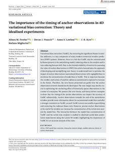 It is advisable to refer to the publisher's version if you intend to cite from this work. See Guidance on citing. To link to this item DOI: 10.1002/qj.5043 Abstract/SummaryVariational bias correction (VarBC), by correcting for significant biases in satellite radiances, is a key component of many modern numerical weather prediction systems. However, there is a risk that VarBC may be contaminated by biases present in the assimilating model, inducing a bias in the analysis and in turn reducing forecast skill. Due to the limited reliability of metrics for assessing the value of anchor observations inNWP, this paper instead takes the approach of developing and exemplifying new theory to understand how to optimise the impact of anchor observations (assimilated observations with negligible bias) to minimise the contamination of model bias in VarBC. This is important because the number and variety of satellite radiances assimilated are expected to increase in the future. Therefore, the new theory presented can guide how the anchor observation network should also be developed. The new insight may also be crucial in optimising the anchoring effect of historically sparse observations in the context of reanalyses. We present this new theory and theory-driven examples to show that the timing of the anchor observations can substantially impact the accuracy of VarBC. Anchor observations towards the end of the assimilation window provide more information about the accumulated model bias and offer a stronger constraint to VarBC; as such VarBC, is more successful at quantifying and correcting the radiance biases only. However, precise anchor observations at the end of the window can increase the contamination of the initial state analysis by model bias. The interaction between the model bias contamination of VarBC and the initial state analysis is studied in idealised cycled data assimilation experiments using the Lorenz 96 model, highlighting the importance of VarBC for an accurate analysis of the state.