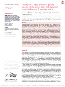 It is advisable to refer to the publisher's version if you intend to cite from this work. See Guidance on citing. To link to this item DOI: 10.1017/S0954422425100140 Abstract/SummaryImpaired glycaemic control is a major risk factor for developing type 2 diabetes (T2D), a worldwide health epidemic intrinsically linked to diet and obesity. Whey proteins (WP) are increasingly popular supplements that are a rich source of branched-chain amino acids (BCAA), essential for muscle protein synthesis and metabolic regulation. In humans, fasting plasma concentrations of BCAA are maintained around 350 µM but become chronically elevated by 10-25% in persons with T2D. Little is known about whether BCAA from WP impacts circulating BCAA concentrations and contributes to this phenomenon. This narrative review used a systematic search approach with relevant keywords to identify evidence from randomised controlled trials in normoglycaemic humans and those with insulin resistance or T2D, on the effects of WP intake on plasma BCAA and glycaemic control. This review is, to the authors’ knowledge, the first to specifically examine the effects of WP intake on plasma BCAA concentrations in relation to glycaemic control. Whilst the majority of acute studies identified (n=6) reported that WP consumption between 10 to 50 g significantly elevates postprandial BCAA and insulin responses (as evidenced by peak concentration and/or area under the curve), evidence from chronic studies (n=3) report inconsistent findings on the impact of 9 to 51g of WP per day on fasting BCAA and glycaemic control (e.g., fasting glucose and insulin, insulin clearance). Findings from this literature review highlight the need for further studies to investigate the relationship between WP consumption with BCAA and glycaemic control, and to determine underlying mechanisms of action.