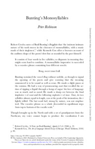 It is advisable to refer to the publisher's version if you intend to cite from this work. See Guidance on citing. To link to this item DOI: 10.1093/camqtly/bfaf017 Abstract/Summary‘Bunting’s Monosyllables’ begins with praise the poet has received for the distinctive economy of presentation in his insistence on the use of simple, concrete Anglo-Saxon-based language in ‘Briggflatts’. Attending to the intonational tunes used in English to give a meaningful rhythmic contour to collocated monosyllables, the essay questions Bunting’s habitual and polemical insistence on the regionally distinct music of his poetry as sole source of its significance. The conclusion considers how these monosyllabic priorities fair towards his long poem’s close when it attempts to resolve into a life-and-art-justifying shape the loss of the childhood love narrated in its opening section.