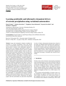It is advisable to refer to the publisher's version if you intend to cite from this work. See Guidance on citing. To link to this item DOI: 10.5194/wcd-6-995-2025 Abstract/SummaryLarge-scale atmospheric dynamics modulate the occurrence of extreme precipitation events and provide sources of predictability of these events on timescales ranging from days to decades. In the midlatitudes, regional dynamical drivers are frequently represented as discrete, persistent and recurrent circulation regimes. However, available methods identify circulation regimes which are either predictable but not necessarily informative of the relevant local-scale impact studied, or targeted to a local-scale impact but no longer as predictable. In this paper, we introduce a generative machine learning method based on variational autoencoders for identifying probabilistic circulation regimes targeted to spatial patterns of precipitation. The method, CMM-VAE, combines targeted dimensionality reduction and probabilistic clustering in a coherent statistical model and extends a previous architecture published by the authors to allow for categorical target variables. We investigate the trade-off between regime informativeness of local precipitation extremes and predictability of the regimes at subseasonal lead times. In an application to study drivers of extreme precipitation over Morocco, we find that the targeted CMM-VAE regimes are more informative of the impact variable of interest, compared to two well-established linear approaches, while maintaining the predictability of conventional non-targeted circulation regimes in subseasonal hindcasts, hence resolving the trade-off identified in previous studies. Furthermore, the targeted regimes and their predictability are physically interpretable in terms of known subseasonal teleconnections relevant to the region, the Madden-Julian Oscillation and variability of the stratospheric polar vortex. The proposed method therefore allows to identify predictable, interpretable and locally relevant representations of regional dynamical drivers given a target variable of interest. These results highlight the potential of the method for a variety of applications, ranging from subseasonal forecasting to attribution and statistical downscaling.