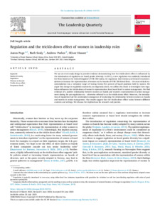 We use an event study design to provide evidence demonstrating how the trickle-down effect is influenced by the introduction of regulation on board gender diversity. In 2011, a new regulation was suddenly introduced for firms listed on the United Kingdom’s FTSE 350 index, the regulatory intervention put forward recommendations to increase the representation of women on the boards of FTSE 350 listed firms – the most critical recommendation was a voluntary target of having twenty-five percent of board positions held by women. We argue this change in regulation represents an exogenous shock, we utilize this shock to investigate how regulation influences the trickle-down of women’s representation from board level to senior management. We find evidence of a positive relationship between women on boards and women’s representation in senior management during the pre-regulation era – otherwise referred to as the trickle-down effect. However, the introduction of regulation had the unintended consequence of weakening the relationship between women on boards and women in senior management. Our results suggest that the trickle-down effect varies between different contexts and settings. We discuss the implications for research and practice.