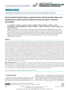 It is advisable to refer to the publisher's version if you intend to cite from this work. See Guidance on citing. To link to this item DOI: 10.1152/ajpregu.00109.2025 Abstract/SummaryInteractions between the gut microbiota and intestinal barrier may contribute to the pathophysiology of high-altitude illnesses. This study aimed to determine the effects of targeting the gut microbiota using dietary supplementation with a blend of fermentable fibers and polyphenol sources on gut microbiota composition, fecal short-chain fatty acids (SCFA) and intestinal function and permeability during hypobaric hypoxia exposure. Healthy adults participated in a randomized, double-blind, crossover study. Food products containing oligofructose-enriched inulin, galacto-oligosaccharide, high-amylose corn starch, cocoa, green tea and cranberry extracts and blueberry powder (FP) or maltodextrin (placebo; PL) were consumed daily during three 2wk phases separated by a ≥1wk washout. During the final 36hr of each phase participants resided in a hypobaric chamber simulating low (LA; 500m) or high (HA; 4300m) altitude creating three experimental conditions: PL+LA, PL+HA, FP+HA. Twenty-six participants completed ≥1 study phase and 13 (12 male; 21±3yr; BMI 25.4±2.4kg/m2) completed all three phases. Results demonstrated that FP mitigated hypoxia-induced increases in intestinal permeability within the small intestine and proximal colon while increasing Bifidobacterium relative abundance and decreasing gut microbiota α-diversity and colonic pH. Higher Bifidobacterium relative abundance and lower colonic pH were associated with greater reductions in intestinal permeability. However, FP did not alter fecal SCFA concentrations and increased gastrointestinal symptoms and altitude sickness during hypobaric hypoxia exposure. Findings suggest that targeting the gut microbiota with a combination of fermentable fibers and polyphenols can prevent hypobaric hypoxia-induced increases in intestinal permeability, but that benefit does translate into a reduction in altitude illness symptoms.