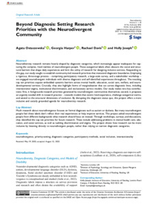 It is advisable to refer to the publisher's version if you intend to cite from this work. See Guidance on citing. To link to this item DOI: 10.1177/27546330251374236 Abstract/SummaryNeurodiversity research remains heavily shaped by diagnostic categories, which increasingly appear inadequate for capturing the complex, lived realities of neurodivergent people. These categorical labels often obscure the social and structural barriers that shape daily experiences and limit the utility of research for designing inclusive services. Responding to this gap, our study sought to establish community-led research priorities that transcend diagnostic boundaries. Employing a rigorous, three-stage process—comprising participatory research, a large-scale survey, and a stakeholder workshop—we engaged neurodivergent individuals with diverse diagnostic and self-identified experiences throughout. The resulting top ten priorities expose embedded systemic barriers across mental health, education, social care, welfare, and neurodevelopmental services. Crucially, they also highlight forms of marginalisation that cut across diagnostic lines, including intersectional stigma, institutional discrimination, and exclusionary service models. Our study makes two key contributions: first, it foregrounds research priorities generated by neurodivergent communities themselves; second, it proposes an urgently needed shift in research practice—towards models that centre lived experience, challenge categorical norms, and attend to the structural dimensions of exclusion. By disrupting the diagnostic status quo, this project offers a more inclusive and socially grounded agenda for neurodiversity research.