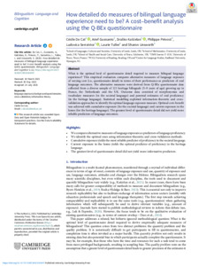 It is advisable to refer to the publisher's version if you intend to cite from this work. See Guidance on citing. To link to this item DOI: 10.1017/s1366728925100497 Abstract/SummaryWhat is the optimal level of questionnaire detail required to measure bilingual language experience? This empirical evaluation compares alternative measures of language exposure of varying cost (i.e., questionnaire detail) in terms of their performance as predictors of oral language outcomes. The alternative measures were derived from Q-BEx questionnaire data collected from a diverse sample of 121 heritage bilinguals (5- to 9- years of age) growing up in France, the Netherlands and the UK. Outcome data consisted of morphosyntax and vocabulary measures (in the societal language) and parental estimates of oral proficiency (in the heritage language). Statistical modelling exploited information theoretic and cross-validation approaches to identify the optimal language exposure measure. Optimal cost-benefit was achieved with cumulative exposure (for the societal language) and current exposure in the home (for the heritage language). The greatest level of questionnaire detail did not yield more reliable predictors of language outcomes.