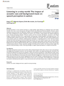 It is advisable to refer to the publisher's version if you intend to cite from this work. See Guidance on citing. To link to this item DOI: 10.1177/13623613251376484 Abstract/SummaryRecognising speech in noise involves focusing on a target speaker while filtering out competing voices and sounds. Acoustic cues, like vocal characteristics and spatial location, help differentiate between speakers. However, autistic individuals may process these cues differently, making it more challenging for them to perceive speech in such conditions. This study investigated how autistic individuals use acoustic cues to follow a target speaker and whether background music increases processing demands. Thirty-six autistic and 36 non-autistic participants identified information from a target speaker while ignoring a competing speaker and background music. The competing speaker’s gender and location either matched or differed from the target. The autistic group exhibited lower mean accuracy across cue conditions, indicating general challenges in recognising speech in noise. Trial-level analyses revealed that while both groups showed accuracy improvements over time without acoustic cues, the autistic group demonstrated smaller gains, suggesting greater difficulty in tracking the target speaker without distinct acoustic features. Background music did not disproportionately affect autistic participants but had a greater impact on those with stronger local processing tendencies. Using a naturalistic paradigm mimicking real-life scenarios, this study provides insights into speech-in-noise processing in autism, informing strategies to support speech perception in complex environments.