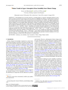 It is advisable to refer to the publisher's version if you intend to cite from this work. See Guidance on citing. To link to this item DOI: 10.1175/JAS-D-24-0283.1 Abstract/SummaryUnderstanding how jet streams respond to a warming climate is crucial for anticipating changes in atmospheric circulation and their broader impacts. Previous studies have highlighted the influence of anthropogenic warming on the meridional temperature gradient, which directly affects jet stream dynamics and variability. This study investigates projected trends in upper-level jet stream shear instability under future climate change scenarios using CMIP6 multi-model simulations. Building on previous findings linking anthropogenic warming to strengthened meridional temperature gradients, we analyse annual means of zonal wind speed, vertical wind shear, and stratification profiles from 2015 to 2100 globally. Results show strengthened multi-model annual-mean vertical shear at 250 hPa, particularly in high-emission scenarios, with trends ranging from 0.04 to 0.11 m s −1 (100 hPa) −1 decade −1 depending on the scenario and region, equivalent to a total relative increase of 16–27% over 86 years. Decreasing trends are observed in the annual-mean Brunt-Väisälä frequency (N 2 ) at 250 hPa, with multi-model ensemble mean values across regions ranging from −0.018 to −0.040 × 10 −4 s −2 decade −1 for lower and higher emissions scenarios, respectively, equating to a total relative decrease of 10–20%. Similarly, the annual-mean Richardson number (Ri) shows decreasing trends of −0.014 to −0.050 decade −1 across emissions scenarios and regions, which is a total relative decrease of 38–47%. These findings suggest more favourable conditions for the generation of Clear-Air Turbulence (CAT), posing critical challenges for aviation safety and operations in a warming climate.