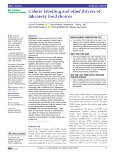 It is advisable to refer to the publisher's version if you intend to cite from this work. See Guidance on citing. To link to this item DOI: 10.1136/bmjnph-2025-001268 Abstract/SummaryBackground Frequent consumption of out-of-home (OOH) foods, including takeaways, is linked to higher energy intake and poorer diet quality. In April 2022, calorie labelling was mandated in England for large OOH businesses to support healthier choices. This paper aimed to explore knowledge and use of calorie labelling when ordering takeaway food online and other factors influencing food choices, overall and by sociodemographic characteristics. Methods A cross-sectional survey of 1040 takeaway consumers in England from an OOH purchase panel assessed knowledge and awareness of calorie labelling legislation, self-reported impact on online takeaway choices, and key drivers of takeaway consumption. Data were analysed using descriptive statistics, logistic regressions and thematic analysis. Results Over 27% of respondents ordered takeaways once or more per week. Respondents aged 35 years and older were less likely (OR 0.28–0.52, p<0.05), while those with obesity were more likely (OR 2.01, p<0.001) to report frequent takeaway purchases. Women were more knowledgeable about the recommended energy meal content than men (OR 2.06, p<0.001), yet only 15% of respondents knew the guideline amount. Awareness of calorie labelling regulations was 63% overall, but was less likely in middle socioeconomic groups (OR 0.56–0.63, p<0.05). During past online orders, 23% noticed calorie labels; of these, 26% reduced food calories ordered, and 10% reduced drink calories ordered. Taste and price were key drivers of takeaway choices, while health and sustainability were less influential. Strong support emerged for healthier menu options and traffic light labelling to help improve the healthiness of takeaway orders. Conclusion Given the limited reported impact, calorie labels may only benefit a minority. As meal healthiness was ranked as a relatively less important driver for takeaway choices, further policies are required to complement calorie labelling in promoting healthier food environments.