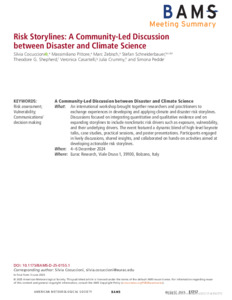 It is advisable to refer to the publisher's version if you intend to cite from this work. See Guidance on citing. To link to this item DOI: 10.1175/BAMS-D-25-0155.1 Abstract/SummaryAn international workshop brought together researchers and practitioners to exchange experiences in developing and applying climate and disaster risk storylines. Discussions focused on integrating quantitative and qualitative evidence and on expanding storylines to include nonclimatic risk drivers such as exposure, vulnerability, and their underlying drivers. The event featured a dynamic blend of high-level keynote talks, case studies, practical sessions, and poster presentations. Participants engaged in lively discussions, shared insights, and collaborated on hands-on activities aimed at developing actionable risk storylines.