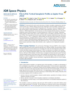 It is advisable to refer to the publisher's version if you intend to cite from this work. See Guidance on citing. To link to this item DOI: 10.1029/2025JA034066 Abstract/SummaryWe present the first pole-to-pole observations of Jupiter's ionosphere, capturing dawn and dusk vertical structure up to 5,000 km altitude using the James Webb Space Telescope (JWST), simultaneous to Juno's radio occultation experiments (ROX) in September 2023. We produce vertical temperature global maps showing largely constant temperatures with altitude. Mean temperatures range from 650 K at low latitudes to 800 K at high latitudes. Auroral emissions were observed at the north and south pole, with northern temperature profiles showing signatures of localized heating (up to 1900 K) at low altitudes. Temperature-latitude gradients exhibit steeper slopes at dusk compared to dawn at all altitudes, particularly between 1,500 and 1,700 km. We also produce the first pole-to-pole vertical volumetric number density map, with auroral densities of up to peaking near 1,500 km altitude. We find a dawn-dusk asymmetry at sub-auroral and equatorial latitudes, with higher densities at dawn ( ) compared to dusk ( ) between 1,500 and 1,700 km. While photochemical equilibrium (PCE) theory predicts higher densities at dusk, the presence of enhanced dawn densities implies that additional processes—such as particle precipitation and plasma transport, particularly at high and mid latitudes—play a significant role in shaping the ionospheric structure.