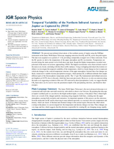 It is advisable to refer to the publisher's version if you intend to cite from this work. See Guidance on citing. To link to this item DOI: 10.1029/2025JA034261 Abstract/SummaryWe present near‐infrared observations of the northern aurora of Jupiter using the NIRSpec instrument on the James Webb Space Telescope, mapping emissions from H+ 3 and CH4 across the polar region. The data were acquired over a period of ∼4 hr, providing a temporally averaged view of these emissions. From the H+ 3 spectra we derive the temperature of the upper atmosphere and H+ 3 ion densities. Temperatures are elevated along the main auroral oval at both dawn and dusk, though the highest temperatures recorded were poleward of the main oval at dawn, approaching 1500 K. The highest ion densities were observed dusk‐ward of the main oval, closely correlating with the observed H+ 3 radiance. Using overlapping individual observations (or dithers) we investigate the temporal variability of the temperatures, which we found change too fast to represent wholesale changes to the vertical temperature structure of the upper atmosphere. Instead, these fast changes are likely connected to variable electron precipitation energies, which produce H+ 3 at different altitudes that sample different parts of the thermospheric temperature profile. The 3.3 μm CH4 fundamental and hotband emissions are brightest at 210°Wclose to the pole, which has been seen previously. However, we also see emission along the main oval, suggesting excitation of this non‐LTE emission by direct precipitation. Lastly, we suggest that the CH4 band ratios can be used to trace the penetration depth of the precipitating electrons, and therefore their energies.