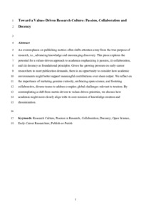 It is advisable to refer to the publisher's version if you intend to cite from this work. See Guidance on citing. To link to this item DOI: 10.1177/00472875251359513 Abstract/SummaryAn overemphasis on publishing metrics often shifts attention away from the true purpose of research, that is, advancing knowledge and encouraging discovery. This piece explores the potential for a values-driven approach to academia emphasizing (i) passion, (ii) collaboration, and (iii) decency as foundational principles. Given the growing pressure on early-career researchers to meet publication demands, there is an opportunity to consider how academic environments might better support meaningful contributions over sheer output. We reflect on the importance of nurturing genuine curiosity, embracing open science, and fostering collaborative, diverse teams to address complex global challenges relevant to tourism. By contemplating a shift from metric-driven to values-driven priorities, we discuss how academia might more closely align with its core mission of knowledge creation and dissemination.