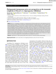 It is advisable to refer to the publisher's version if you intend to cite from this work. See Guidance on citing. To link to this item DOI: 10.1002/tax.70002 Abstract/SummaryMuscari s.l. (Asparagaceae, Scilloideae) is a widespread genus of bulbous geophytes native to the Mediterranean, the Middle East and into the Caucasus. Based on inflorescence and floral morphology, four distinct groups have long been recognised and treated as either genera (Muscari s.str., Muscarimia, Leopoldia, Pseudomuscari) or subgenera within Muscari s.l. However, a recent molecular phylogenetic investigation proposed a new subgenus, Pulchella. Despite the several morphological and molecular phylogenetic investigations of Muscari, the delineation of taxa, either at the generic or subgeneric level, remains unstable. Here we aim to evaluate the monophyly and robustness of the recognised groups using broadly sampled nuclear (low‐copy number and ribosomal cistron) and plastome sequence phylogenies of Muscari s.l. Our morphological and molecular delineation of M. subg. Muscarimia and subg. Pseudomuscari across the analyses of three data sources are broadly congruent. However, high levels of incongruence within M. subg. Leopoldia and subg. Muscari are reported and discussed here, with implications for the stability of the newly described M. subg. Pulchella. Nomenclatural rules also require a new subgenus name to replace the name Pseudomuscari, which is shown to be a synonym of subgenus Muscari and has therefore been misapplied in recent work.