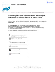 Knowledge sources for Industry 4.0 technologies in European regions: the role of inward FDIsBello, M., Castellani, D., Damioli, G., Marin, G. and Montresor, S. (2025) Knowledge sources for Industry 4.0 technologies in European regions: the role of inward FDIs. Industry and Innovation. ISSN 1366-2716