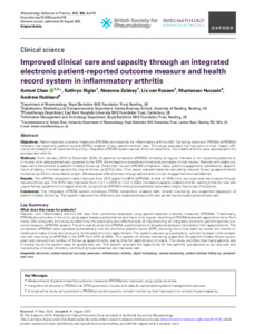 It is advisable to refer to the publisher's version if you intend to cite from this work. See Guidance on citing. To link to this item DOI: 10.1093/rap/rkaf101 Abstract/SummaryObjectives Patient-reported outcome measures (PROMs) are essential for inflammatory arthritis (IA). Collecting electronic PROMs remotely into electronic patient records (EPRs) enables timely, patient-centred care. This study evaluated the real-world clinical impact, efficiency, and feasibility of implementing a fully integrated ePROM system across three IA conditions: rheumatoid arthritis, axial spondyloarthritis and psoriatic arthritis. Methods From January 2019 to December 2024, IA patients completed ePROMs remotely at regular intervals or on request by patients or clinicians, with data automatically uploaded to EPR. Alerts based on predefined thresholds prompted clinical review. Patients with stable disease were transitioned to patient-initiated follow up. Outcomes include ePROM completion rates, patient engagement, satisfaction, appointment utilisation, time savings and the new-to-follow up (N: FU) ratio. Time saved was estimated by calculating reduced follow-up appointments multiplied by 20-minute consultation length. We assessed effectiveness through patient and clinician engagement and satisfaction. Results The ePROM completion rates improved from 25% (paper) to 66% (ePROM). A total of 1500 clinic hours per year were saved through reduced follow ups. The N: FU ratio improved from 1:3.1 in 2019 to 1:2.2 in 2024. Increased capacity enabled shorter waiting times for new and urgent follow up patient clinic appointments. Longitudinal ePROM trends provided better actionable insight than single time points. Conclusion The integrated ePROM system enhanced PROM completion, enabled safe remote monitoring and supported expansion of PIFU. The system improved the efficiency and responsiveness of IA care as well as promoted personalised care.