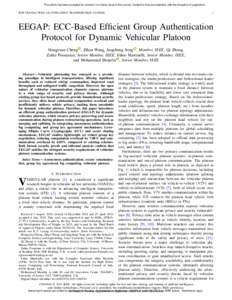 EEGAP: ECC-based Efficient Group Authentication Protocol for dynamic vehicular platoonCheng, H., Wang, Z., Song, J., Zhong, Q., Pooranian, Z. and Martinelli, F. (2025) EEGAP: ECC-based Efficient Group Authentication Protocol for dynamic vehicular platoon. IEEE Transactions on Intelligent Transportation Systems, 26 (11). 20392 -20406. ISSN 1524-9050