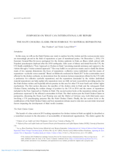 It is advisable to refer to the publisher's version if you intend to cite from this work. See Guidance on citing. To link to this item DOI: 10.1017/aju.2025.10015 Abstract/SummaryIn this essay, we will use the Haiti Cholera case study to explore how the victims and the socioeconomic turns are increasingly pivotal in the field of reparations as part of transitional justice. On December 1, 2016, UN Secretary General Ban Ki-moon apologized for the cholera epidemic in Haiti, an illness which arrived with Nepalese peacekeepers deployed after the 2010 earthquake. After years of silence and denial from the UN, the UN finally established a “New Approach to Cholera in Haiti,” promising material assistance and support to the victims through a “victim-centered approach.” The essay builds on our previous matrix used to clarify the debate made of two separate dimensions: the focus of reparations—collective versus individual—and the means of reparations—symbolic versus material.1 Based on fieldwork conducted in March 2017 in the communities most affected by the cholera outbreak, we demonstrate how the tensions between reparations offered by the UN (with a preference for collective symbolic reparations) and the reparations demanded by the victims (individual material reparations) can help explain why reparations were not fully (at best) successful in providing justice for the Haiti cholera victims and hopefully inform practice in this area for other UN trust funds and victims’ rights mechanisms. The first section discusses the specifics of the cholera crisis in Haiti and the subsequent Haiti Cholera Claims, including the sudden change of position by the UN in 2016 and the nature of reparations included in the New Approach to Cholera in Haiti. The second section looks at the reparations debate and the preferences expressed by the affected communities in Haiti. The third section puts the Haiti Cholera Claims in perspective, discussing the Kosovo Lead Poisoning case and the Mothers of Srebrenica case, both third party cases involving a UN peacekeeping presence like the Haiti Cholera Claims. Finally, the last section looks at the ramifications of the Haiti Cholera Claims and how reparations debates need to take into account wider structural factors impacting the development of third world countries.
