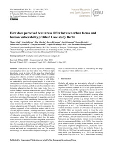 It is advisable to refer to the publisher's version if you intend to cite from this work. See Guidance on citing. To link to this item DOI: 10.5194/nhess-25-2481-2025 Abstract/SummaryUrban areas in all world regions are experiencing increasing heat stress and heat-related risks. While in-depth knowledge exists in terms of the urban heat island effect and increased heat stress in cities in the context of climate change, less is known about how individual heat perceptions and experiences differ between urban forms or with different vulnerability profiles of exposed people. It is crucial to identify and assess differences within cities relating to urban form and social structure, as both need to be considered when designing adaptation plans for heat-related risks. Here, we explore linkages between urban structure types (USTs), heat stress perception and different socio-economic groups' experiences in Berlin using a household survey, statistical and earth observation data. Our approach (1) quantifies perceived heat stress across USTs, considering characteristics such as, age, income, vegetation cover and shade, (2) characterises social dimensions of USTs to enhance their application in climate adaptation and (3) benefits from the synergistic disciplinary approach of the urbisphere project with rich social and physical datasets. Although heat stress exposure is higher in the inner-city ring, we find that a higher percentage of vulnerable groups in the outer city (6 to 18 km from the city centre), where 78 % of Berlin's elderly live. We underscore the need for attention in future adaptation plans based on the USTs, human vulnerability profile and adaptive capacities. For example, in densely spaced building blocks 67 % of respondents perceived high heat stress and fractions of vegetation and shade are comparatively very low. The method and findings can inform future adaptation strategies of other cities to consider different profiles of vulnerability and adaptive capacities within and between USTs.